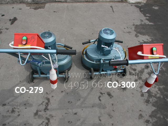 Мозаично-шлифовальная машина СО-300, состоит из шлифовальной головы и ходового устройства. Шлифование бетонных поверхностей производится шестью фрезами с алмазными сегментами, устанавливаемыми в державках на траверсах и удерживаемыми пружинными кольцами. В состав шлифовальной головы входит электродвигатель, установленный на цилиндрическом двухступенчатом редукторе с двумя выходными валами. На валах закреплены траверсы с абразивными или алмазными фрезами.