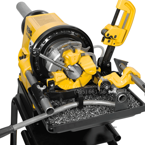 • Резьбонарезной станок REMS Магнум до 2" в рабочем состоянии на тележке с колёсами и подносом для стружки